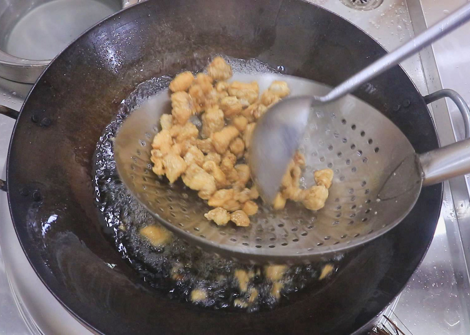 把油温升高至7成热 ,炸第二遍,把鸡块炸酥炸香,下锅20秒后立即捞出,炸得久了鸡块就老了。