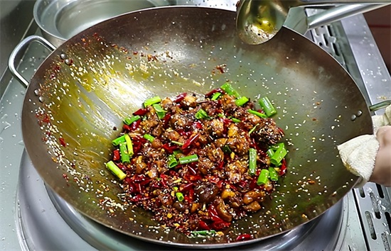 ,然后再放干辣椒段,闻到香辣味以后,倒入炸好的兔肉,加入白糖,食盐,鸡粉,孜然粉,颠锅翻炒,让调料均匀裹在兔肉上面。