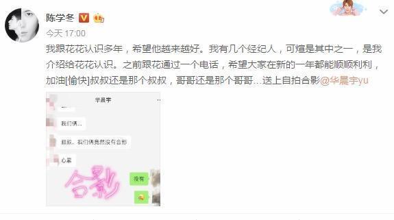 1月2日,陈学冬发文表示与华晨宇认识多年,新经纪人乔可煊是自己介绍的,而且此前还是他本人的经纪人,他有多位经纪人,乔可煊就是其中之一。陈学冬的配图是两个人的聊天记录,在上面P上了“合影”两个字,虽说两个人认识多年却没有一张合影,难道是塑料兄弟情吗?