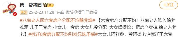 信息来源:“深圳广播电影电视集团都市频道《第一现场》”——(六套房产分配不均?八旬老人陷入赡养难题 儿子三套房 小女儿一套房 大女儿没分配 大女婿提议:把房产卖掉 给老人养老)