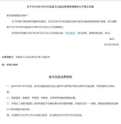 紧接着,南都记者注意到,盒马云超近日发布运费调整规则,并公开征集意见。今年3月18日起,盒马云超自营商品配送不满49元收取6元运费,相比此前上涨10元。据了解,盒马云超的自营商品次日送达,第三方商家的商品按快递发货。
