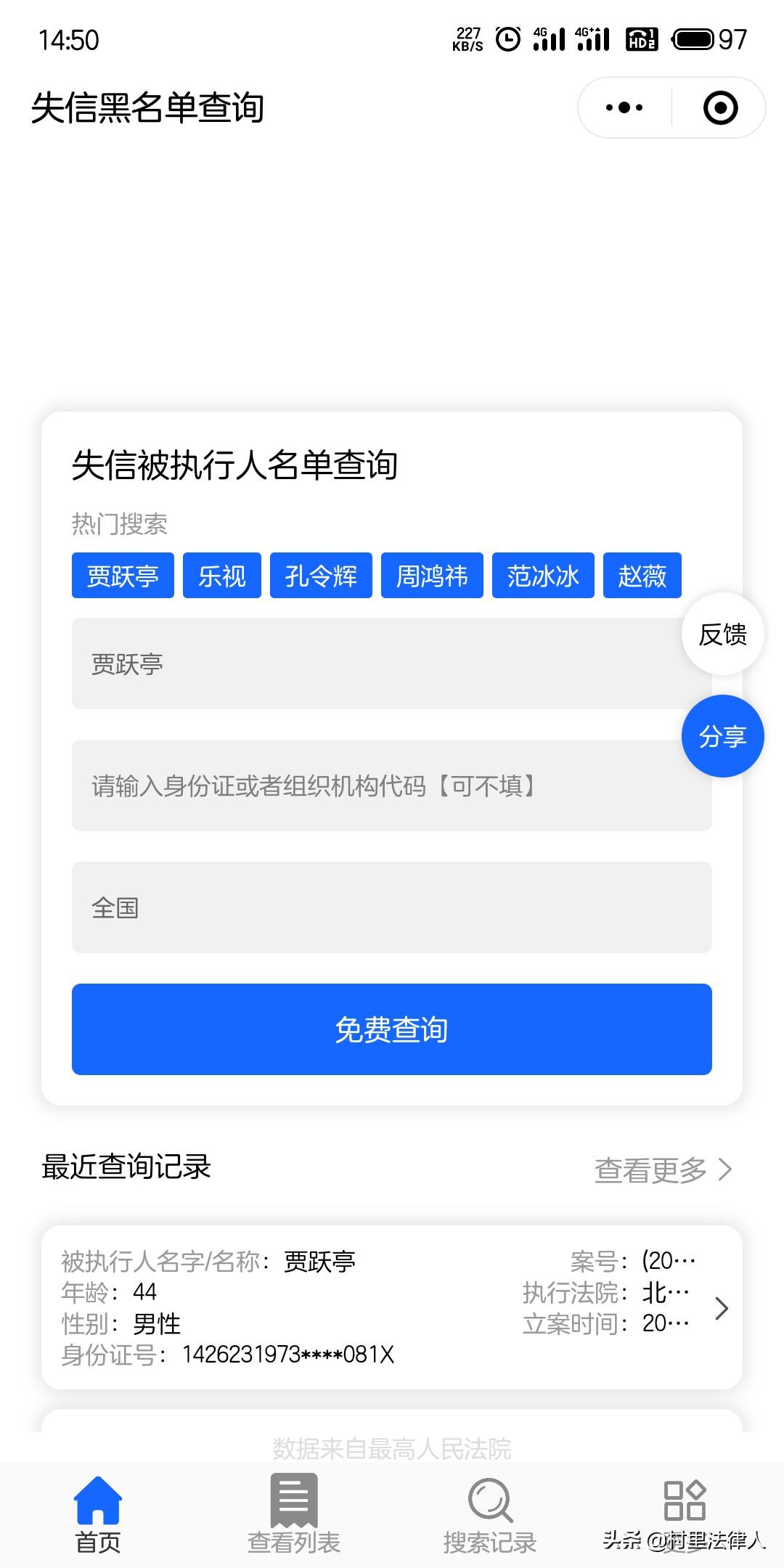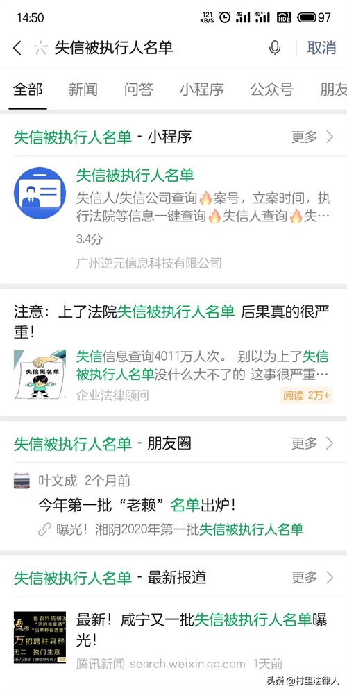 除了上面通过“中国执行信息公开网”查询“老赖”信息,还可以通过微信中的“失信被执行人名单”小程序。