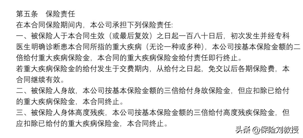 这款产品在历史上同系列有7款,并不是每一款都一样。咱们就险种代码S42,赔付最多是3倍保额,即直接身故。2倍保额,即确诊重大疾病,身故再赔1倍保额。