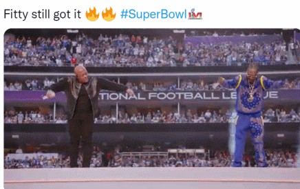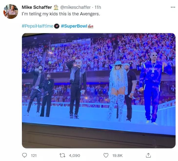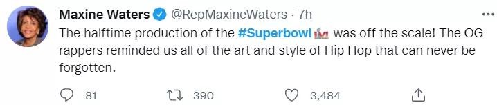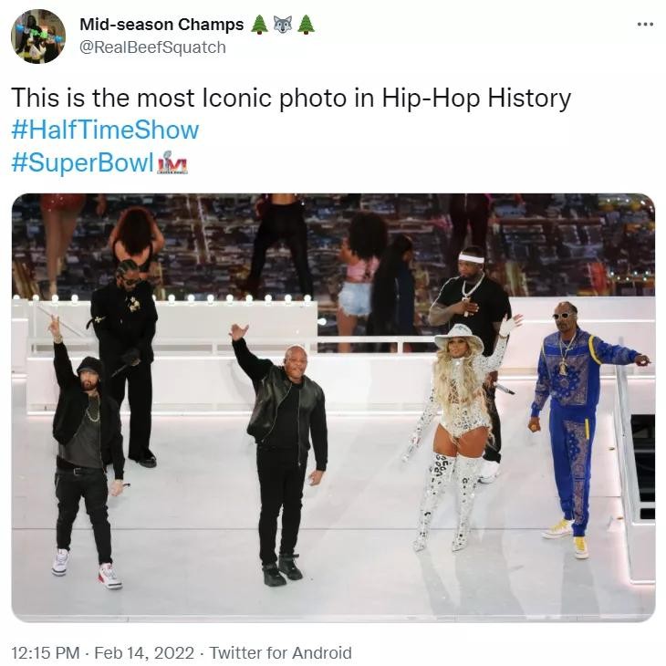 “超级碗中场秀的水准冲出天际了!这些元老级别的说唱大神的表演就是在告诉我们,嘻哈精神永不朽!”