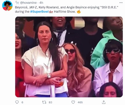 Jay-Z、碧昂斯、Kelly Rowland和Angie Beyince,也上演了真实观众反应,跟着大合唱了《Still Dre》。