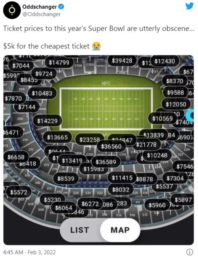 今年的超级碗在洛杉矶公羊队的主场SoFi球场举行。年年门票都是一票难求,而今年票价更是高得吓人。