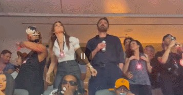 大本和女友J·Lo,一动一静组合有点好玩,网友表示,这是老公陪老婆去看演唱会的既视感。
