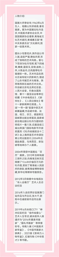 李幼华,1962年6月生人、祖籍山东郯城县,著名画家。誉为中国画坛牡丹圣手,中国美术家协会会员,中国国画家协会理事,青海省文化艺术顾问,柬埔寨王国"柬中关系委员会"文化顾问,国家一级美术师。