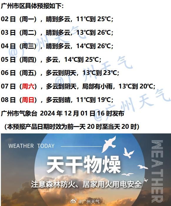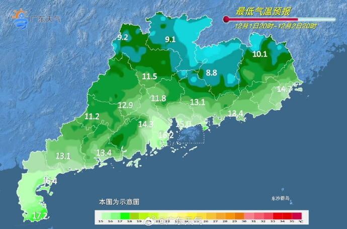 12月2-3日,广东大部晴到多云,部分市县早晚有轻雾或雾。早晨最低气温:粤北和珠江三角洲北部市县7~12℃,南部沿海市县15~18℃,雷州半岛市县18~21℃,其余市县12~15℃。