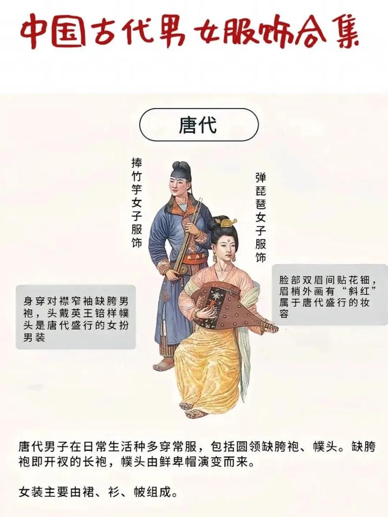 唐朝服饰华丽开放,男子常服为圆领袍、裹幞头、着长靿靴,女子衫、裙、帔色彩鲜艳图案丰富。