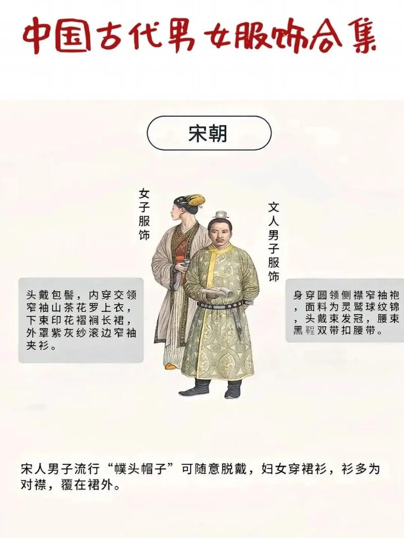 宋朝服饰淡雅恬静,男子着长袍、幞头,女子服饰有襦、袄、衫、裙、褙子。