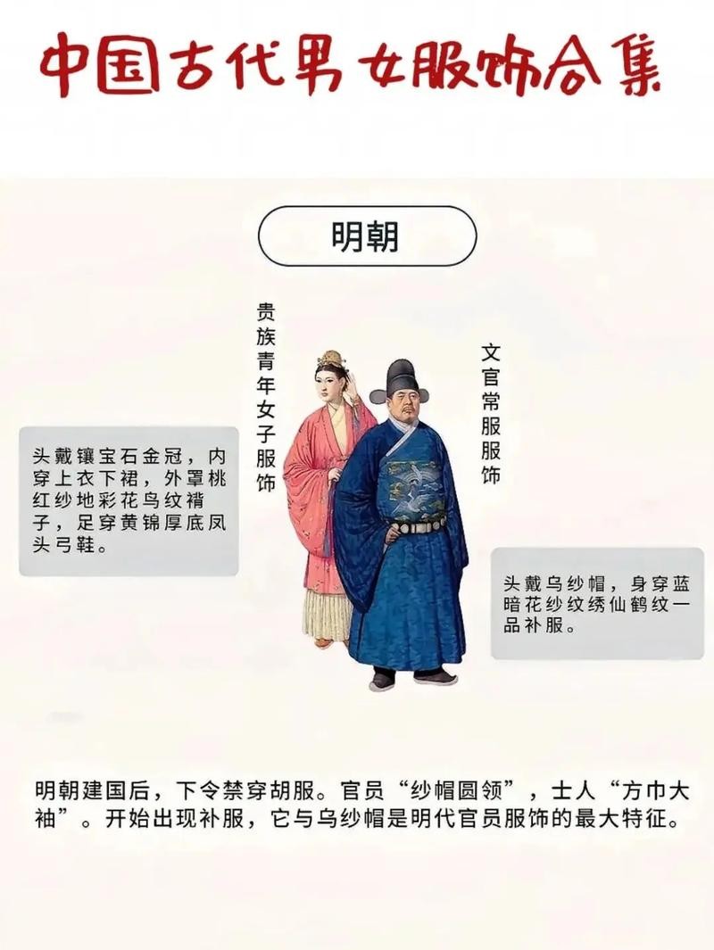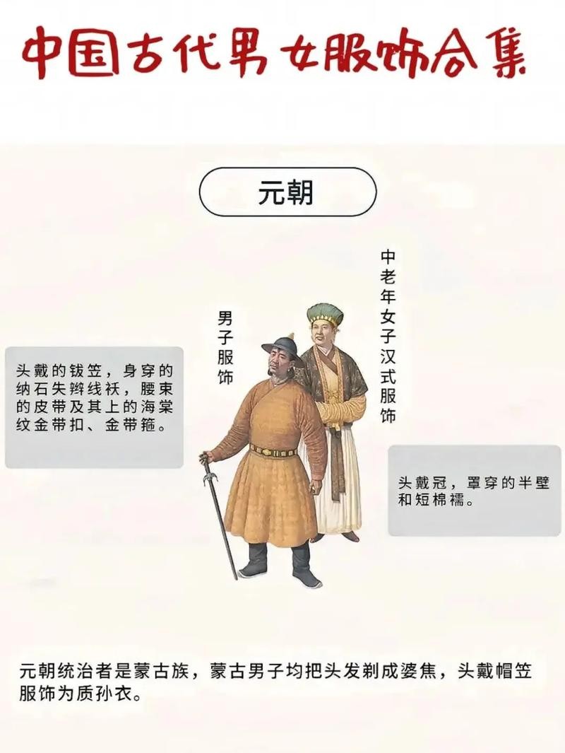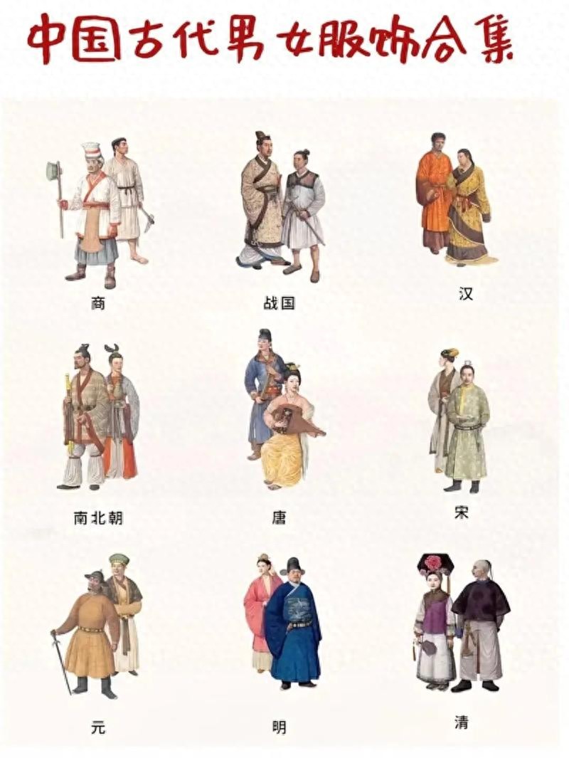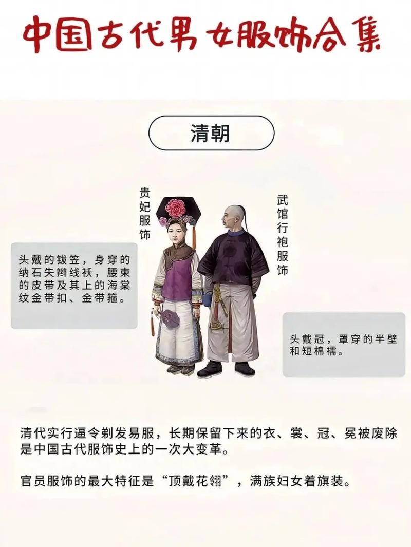 清朝推行剃发易服,男子改着满族服饰,女子以旗袍为主,色彩淡雅。不同朝代的服饰在样式、颜色、材质等方面各异,反映出当时的社会文化和审美观念。
