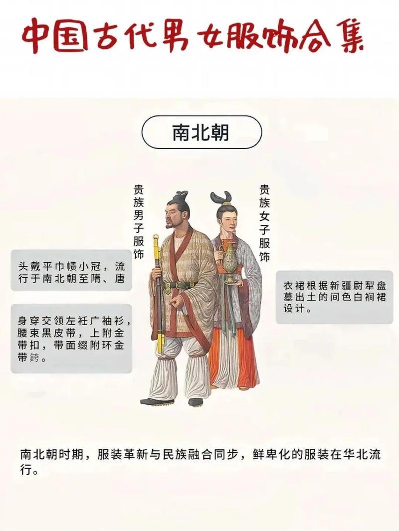魏晋南北朝时期,魏晋男子以衫代袍且衫袖更宽大,女子服饰样式变为上俭下丰、窄袖紧身;南北朝北朝女装流行两裆常与裤配穿,还有充满灵动气质的“杂裾垂髾服”。