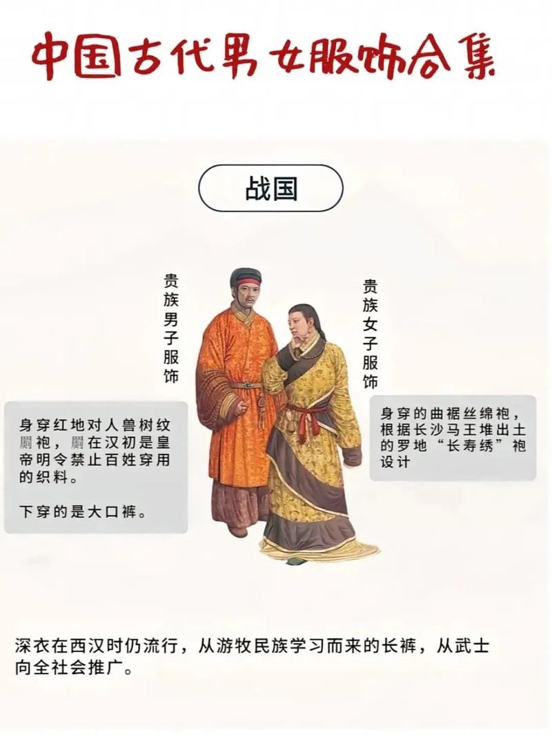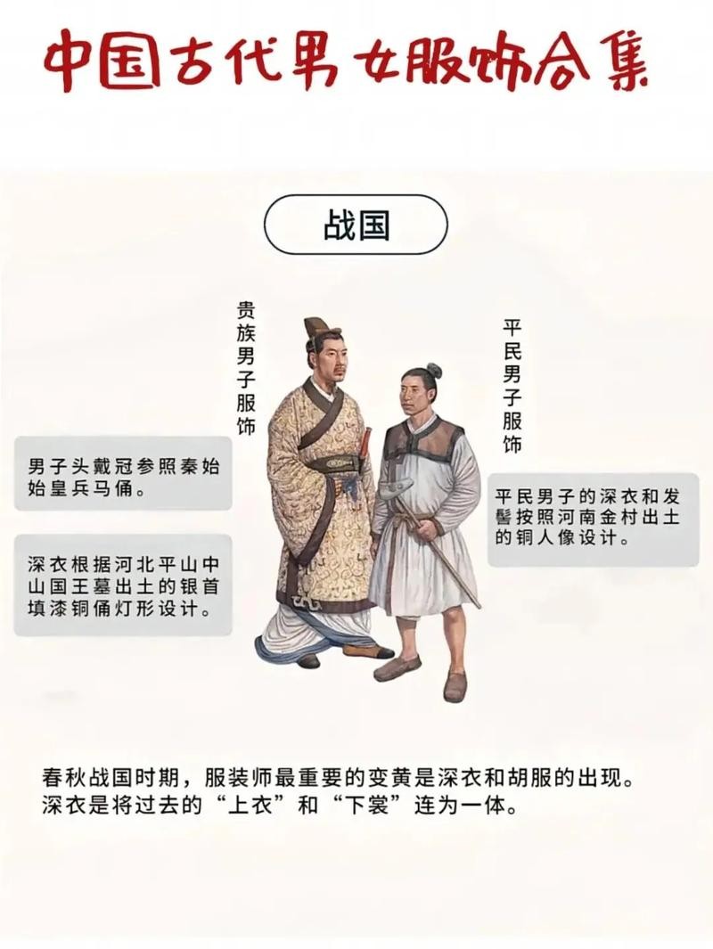 战国深衣和胡服流行,深衣连属上下不相连的衣和裳,胡服是北方草原游牧民族的短衣、长裤和靴为主的服饰。