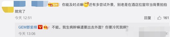 私下的邓紫棋性格直爽,受到很多人喜爱,10月21日,邓紫棋晒出自己的外景照,并隔空问网友"是否满意",有网友评论称:"你能及时点吗,多尝试外景,别老在酒店拉窗帘当背景",随即邓紫棋幽默回复该网友,她表示"我生病了干嘛要去外面,你要冷死我吗。"