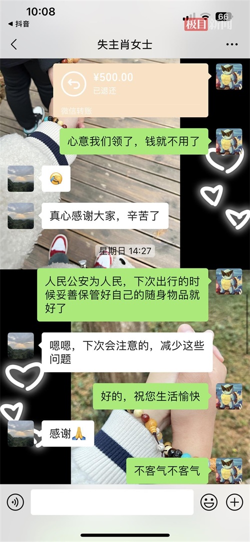 看到手机失而复得,肖女士非常惊喜,当即对三峡机场民警认真负责和神速找回手机表示感谢,并执意给民警微信转账500元,但被民警谢绝。