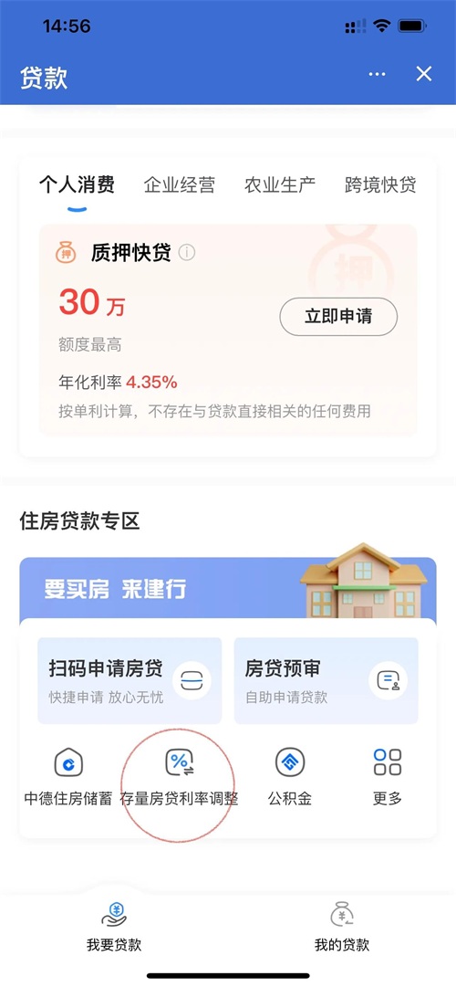 第二种首页点击 贷款 下方有个 “存量房贷利率调整”