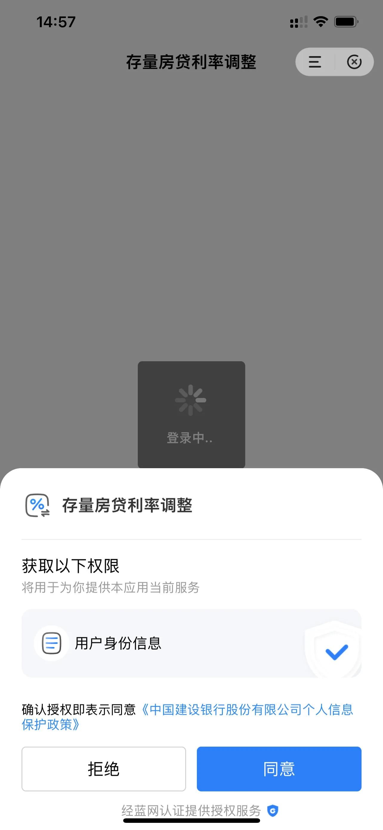 2、点进进入存量房贷利率调整,会弹出授权信息,点击同意即可查看你在建行的住房贷款;