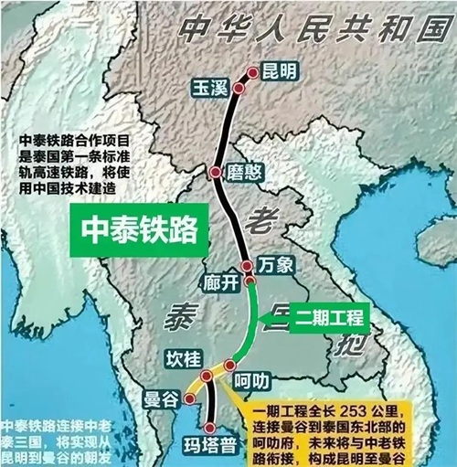 中泰铁路完全建成后,将形成一条从中国昆明经老挝万象、泰国曼谷,再直达马来西亚和新加坡的“黄金大通道”,也就是泛亚铁路的中通道,届时中国与主要东盟国家实现了铁路连通,大大促进产业协作发展和经贸人员往来。
