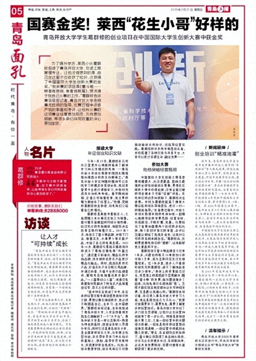 青岛开放大学学生葛群修的创业项目在中国国际大学生创新大赛中获金奖