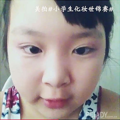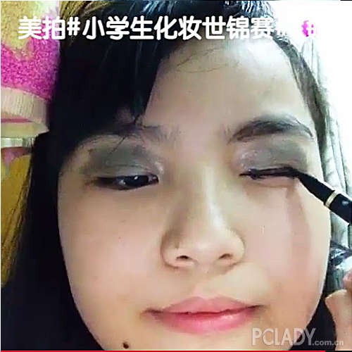这位小姑娘以高超的颜艺和精湛的手法暂时领先其他选手,眼皮上两块大小适中形状迥异的不明物体就是传说中的眼部打底,姑娘别出心裁保留自己原本的肤色然后用BB霜为眼睛打底,省去了涂抹全脸的时间,重点照顾重点部位,上班族真应该好好学学。