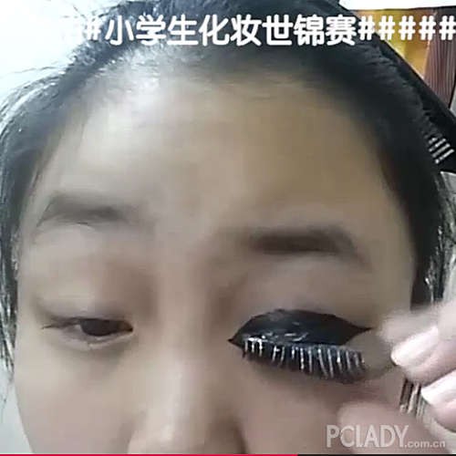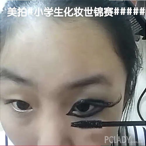 画完眼线,贴好假睫毛好不忘刷一层睫毛膏让睫毛和假睫毛之间贴合更紧密更自然,认真的说,小学生有这样的意识真的不是临时搜索教程才能有的,平时一定有不少联系和关注化妆的知识,也一定不少祸害妈妈的化妆品......
