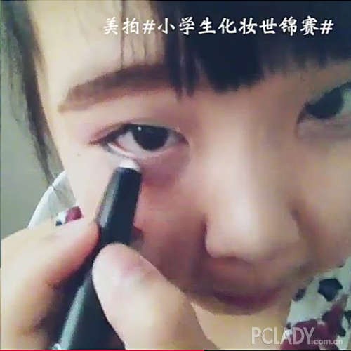 萝莉暗黑风的眼影画好了,再用黑色眼线笔增加眼神的电力,小小年纪在录视频中坐怀不乱化妆顺序丝毫不差,面带微笑从容不迫地从眼头到眼尾一笔流畅一笔画出一条妩媚而又浓郁的眼线。