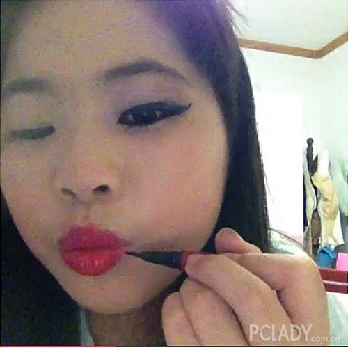 涂个唇膏嘛没什么,大家都会,用唇刷刷匀称了就行,然而接来下就是秘诀所在致胜的关键了,你以为她拿的是唇线?太小瞧人了吧,唇线哪有眼线笔牛啊,慷慨激昂的黑色搭配霸气侧漏的纯红色才是唇妆的正解。