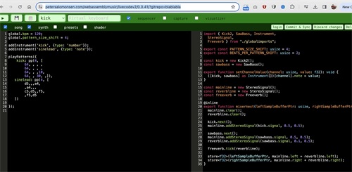 Peter Salomonsen 的 WebAssembly Music Experiment 是一个网络音乐实时编码编辑器,其中的乐器是在 AssemblyScript 中实现的。