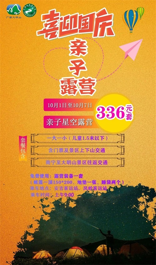套票包含:两人景区门票+露营一晚+南宁至大明山往返交通套票(一大一小,含1.5以下儿童)。购买露营套票可免费使用露营装备一套(含150*200帐篷一顶、地垫一张、睡袋两个)