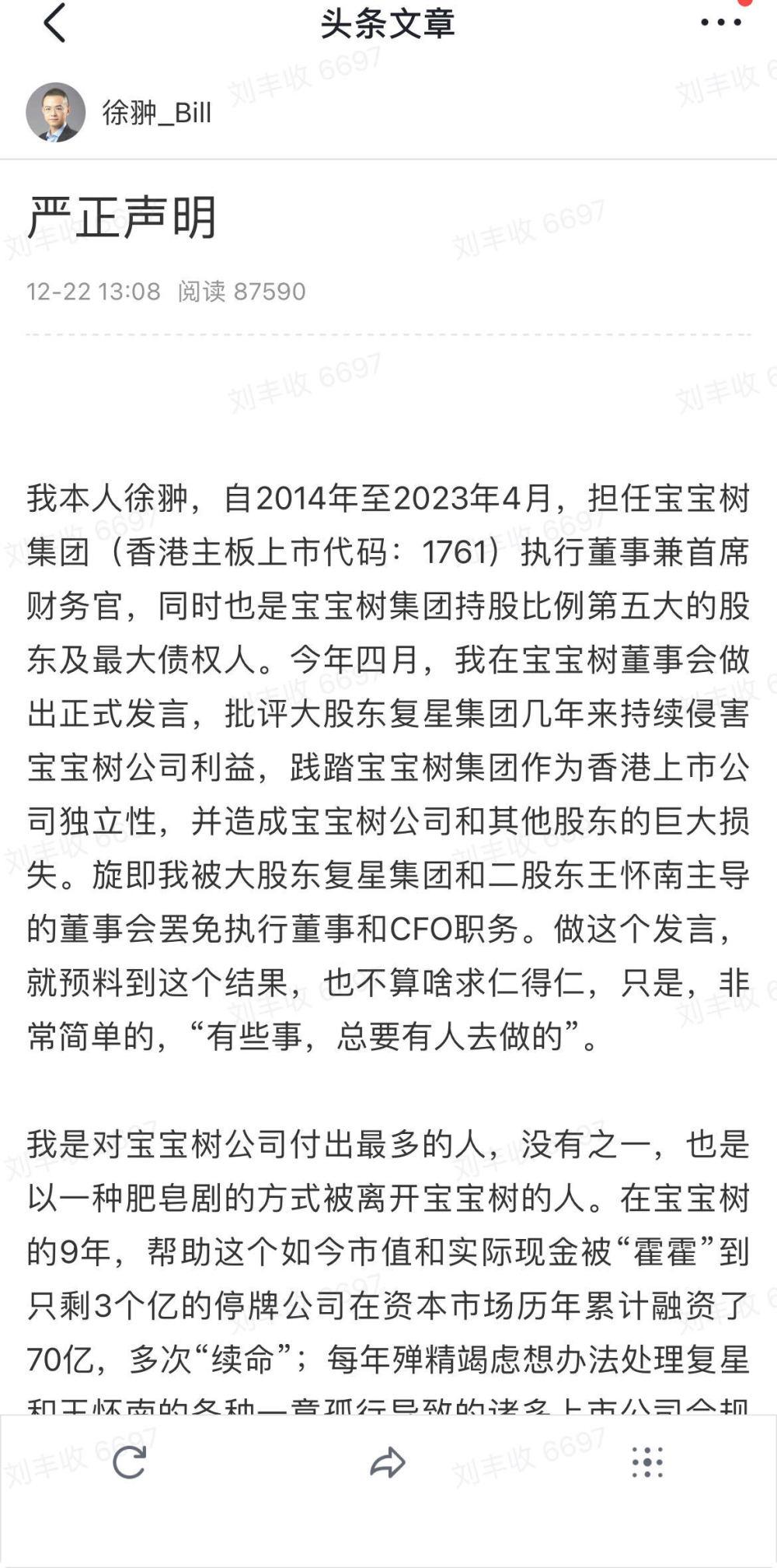 三言科技 12 月 23 日消息,12 月 22 日,宝宝树前 CFO 徐翀发文称,自 2014 年至 2023 年 4 月,自己担任宝宝树集团(香港主板上市代码:1761)执行董事兼首席财务官,同时也是宝宝树集团持股比例第五大的股东及最大债权人。" 今年四月,我在宝宝树董事会做出正式发言,批评大股东复星集团几年来持续侵害宝宝树公司利益,践踏宝宝树集团作为香港上市公司独立性,并造成宝宝树公司和其他股东的巨大损失。旋即我被大股东复星集团和二股东王怀南主导的董事会罢免执行董事和 CFO 职务 "。