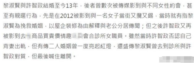 尽管当时有新闻爆出黎淑贤曾多次抓获丈夫不忠的证据,导致婚姻关系紧张甚至破裂的传闻,但许智政本人矢口否认这样的指责。