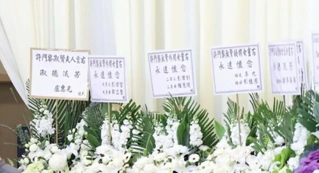 尤其值得一提的是,来自香港男演员兼前夫卢惠光所献上的那幅花牌,更显得尤为醒目,位于灵堂最中心的显赫地位。