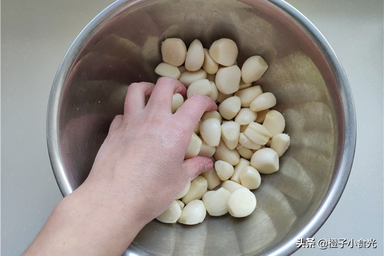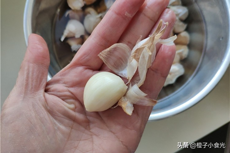 3、大蒜皮泡软后,就很容易剥皮了,很快就能完整地剥出一个蒜瓣,依次把所有的蒜瓣都剥出来。
