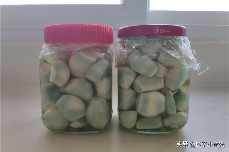 8、一天后大蒜已经开始变绿了,这要比传统的腌制方法快多了,一共放2~3天,就能达到满意的绿色程度,后面再放冰箱保存。