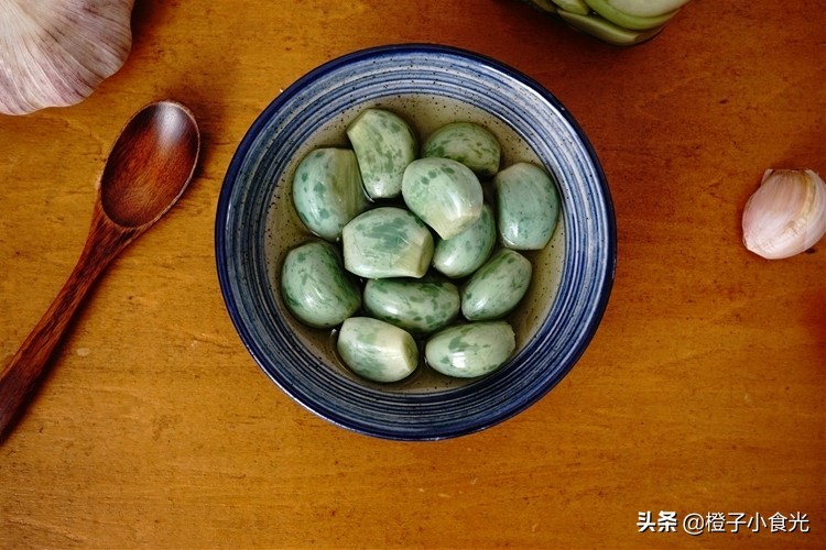这种方法腌制的腊八蒜,我也是第一次尝试,多加一步,把醋煮过高温腌制,再点盐和冰糖,口感脆爽,酸味没那么浓烈,效果还是不错的,变绿速度也快,几乎零失败,想做腊八蒜的可以试试看。