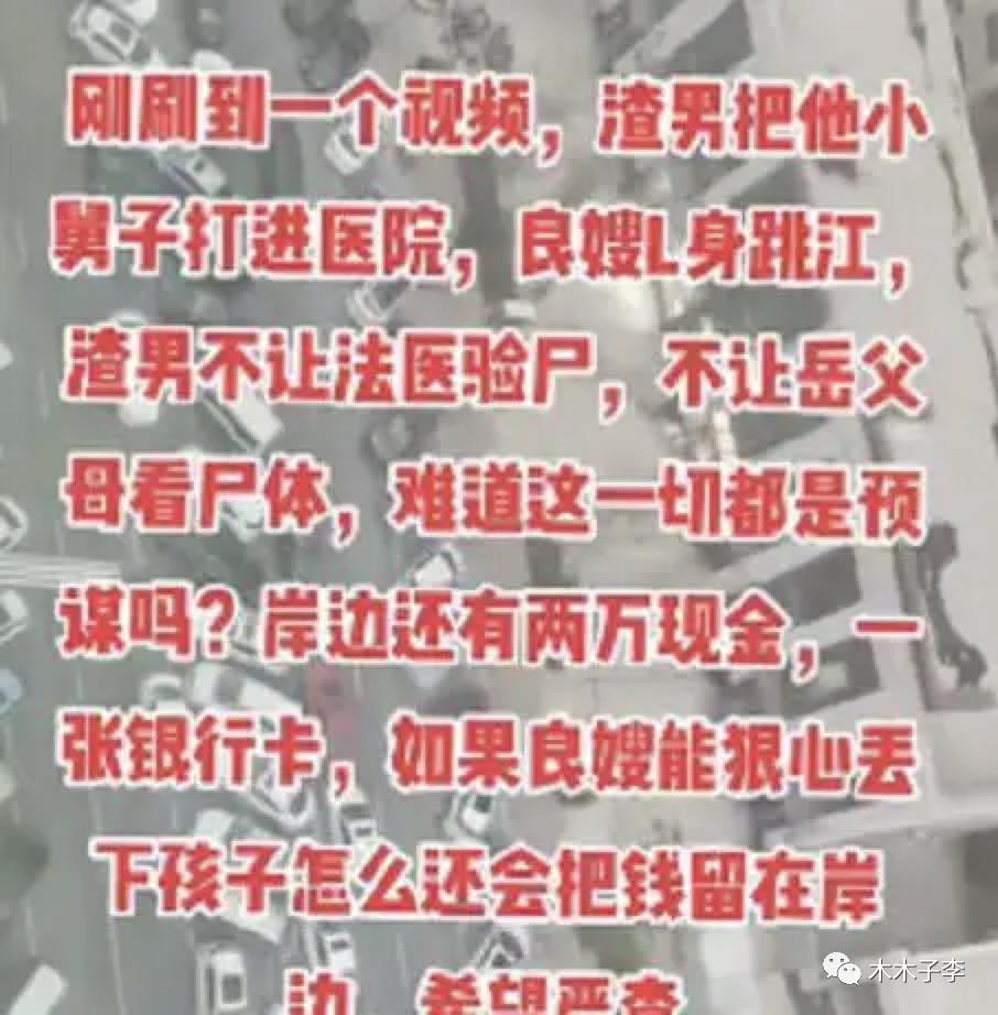 有网友说:良嫂跳江,张良不让法医尸检,也不让岳父岳母看尸体,还把小舅子打进医院,如果叶盈莹真的想自杀,为何岸边还有2万现金和一张银行卡?孩子都能丢下,怎么会把钱留在岸边,希望严查。