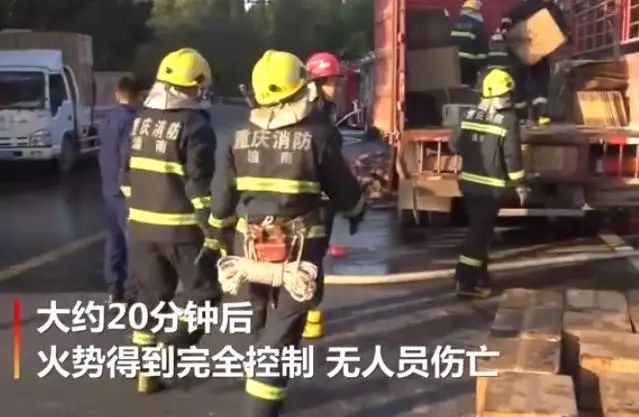 大约20分钟后,火势得到完全控制,无人员伤亡,消防员还帮助货车司机整理好未受损的纸箱。