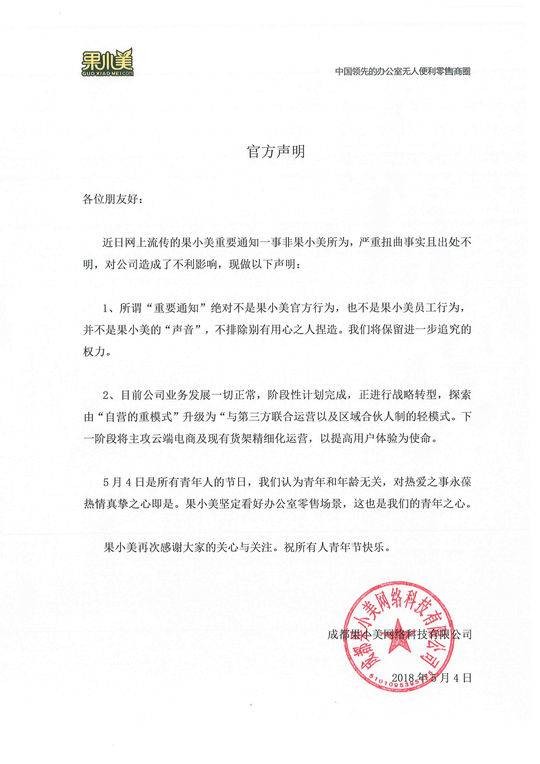 近日网上流传的果小美重要通知一事非果小美所为,严重扭曲事实且出处不明,对公司造成了不利影响,现做以下声明: