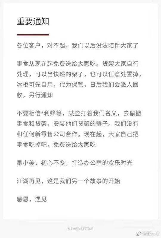 通知写道:“零食从现在起免费送给大家吃。货架大家自行处理,可以当快递的架子,也可以任意处置掉,冰柜可先自用,代为保管,日后我们会派人回收,另行通知。”