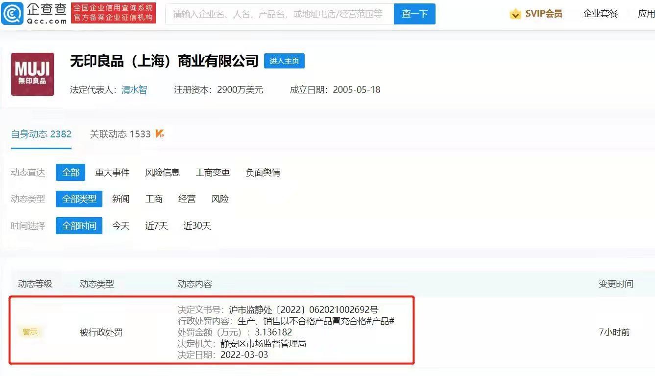 企查查APP显示,近日,无印良品(上海)商业有限公司新增行政处罚信息,处罚事由为生产、销售以不合格产品冒充合格产品,处罚结果为没收违法所得及罚款约3.14万元,处罚单位为静安区市场监督管理局。详情显示,当事人生产的款号为EBC01C0S的MUJI品牌暗黄色男士运动鞋经检测判定不合格,违反了《中华人民共和国产品质量法》第三十二条的规定。