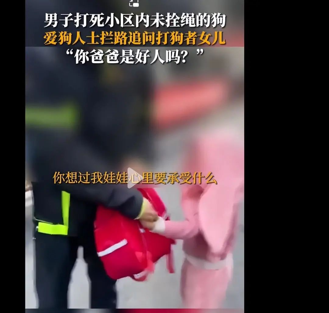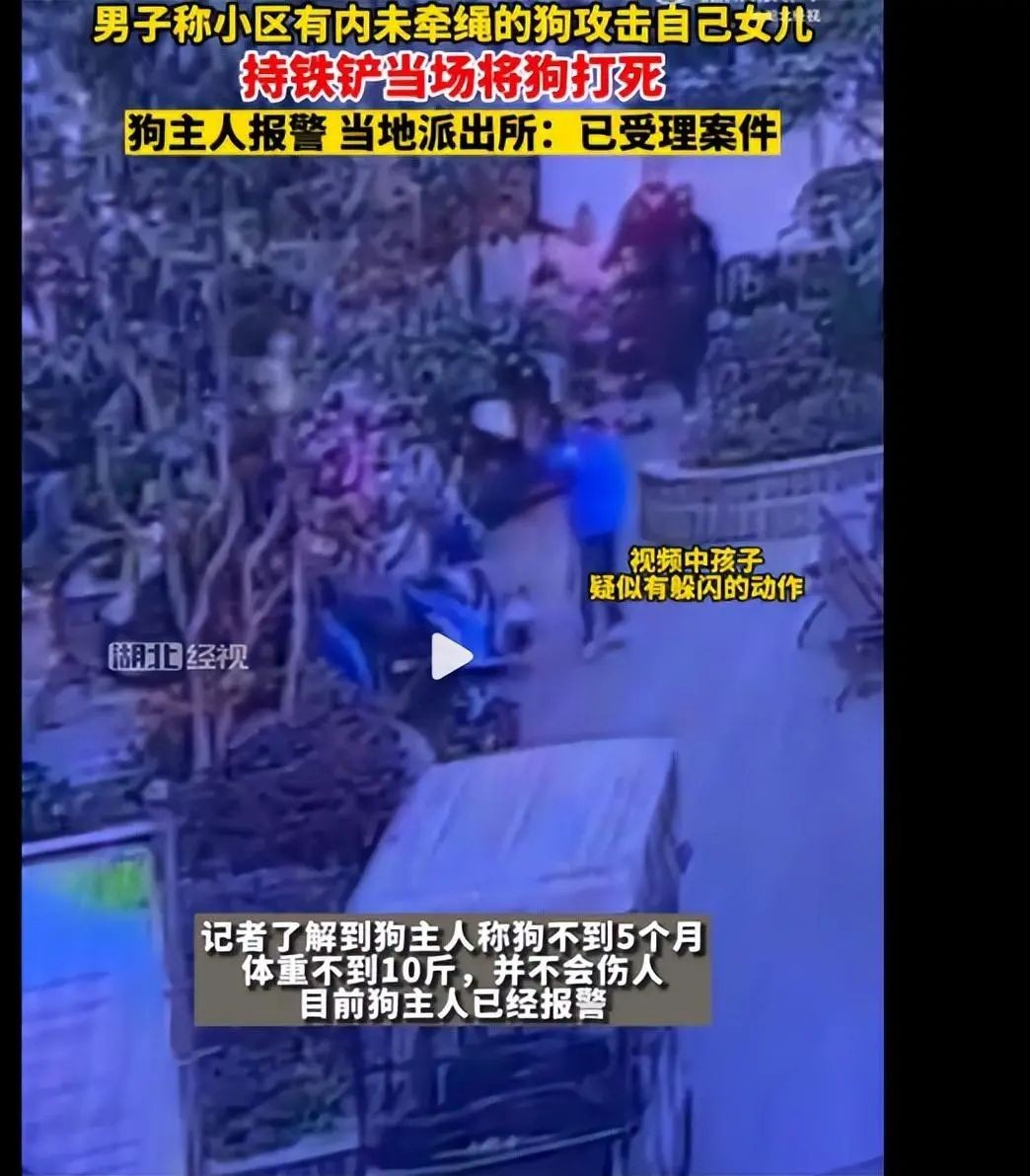 事件的起因,是因为这名女孩的父亲,带着女儿在小区走路时,遇到未拴绳的小狗,父亲认为小狗有攻击女儿的意图,为了保护女儿,直接拿铁锹将小狗打死。