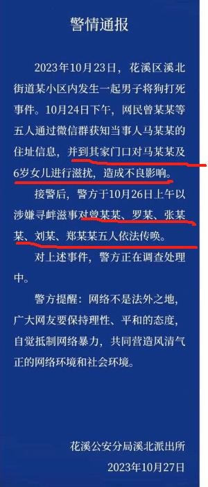 而在打狗父亲和女儿遭遇骚扰后,警方也很快展开调查,得知正是通过微信群,5名爱狗人士得知了打狗父亲以及女儿的住址信息,专门跑到其家门口进行跟踪骚扰。
