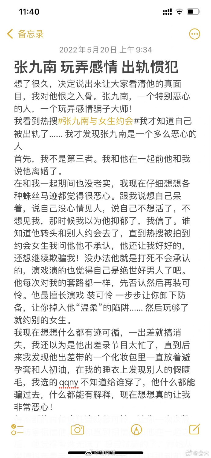 没等多长时间,反转又来了。一位叫“萌阿萌__”的网友直接晒出了张九南出轨的证据,她称当初张九南告诉自己已经离婚,并且他们二人在一起期间,张九南也是频繁偷吃,最后她看到热搜才知道自己成了小三。