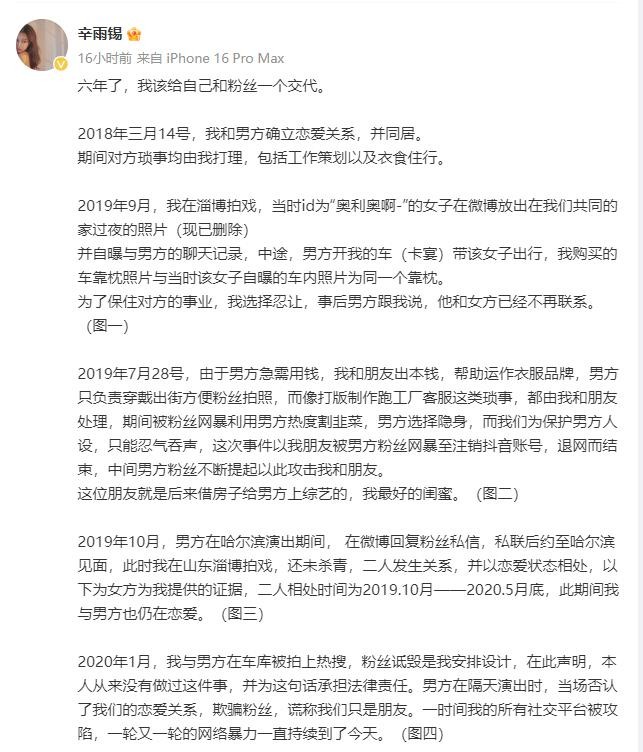 秦霄贤前女友辛雨锡在社交平台上曝了重料,称与秦霄贤交往期间,男方多次出轨,并且还睡粉,陆续晒出了照片和聊天记录的证据。