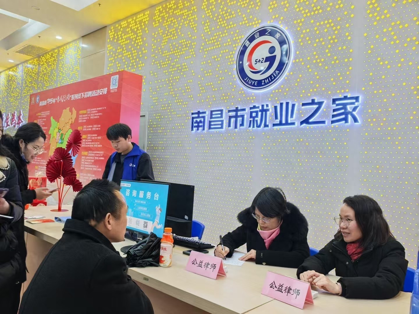 2月15日,南昌市“春风行动”综合大型招聘会在南昌市就业之家三楼招聘大厅举办。由新法治报社和江西省律师协会联合主办的第831期公益律师进社区活动,携手江西省人力资源和社会保障厅、南昌市人力资源和社会保障局送法进招聘会。