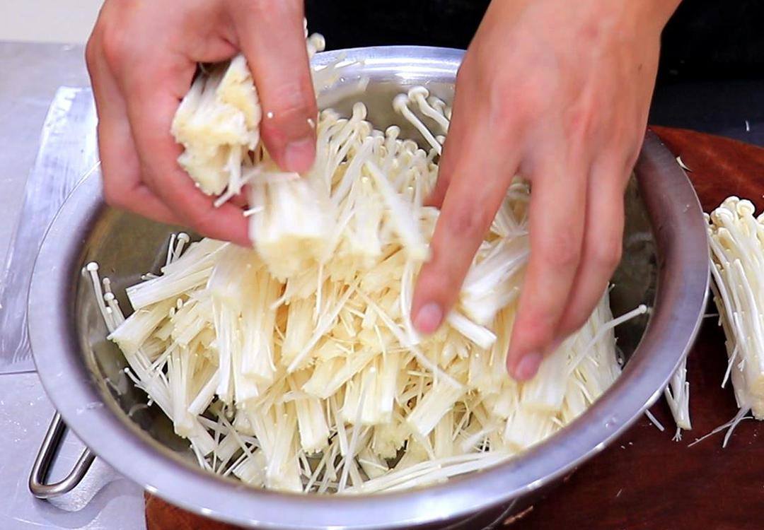 1.准备适量的金针菇,切掉根部,用手掰成小块放入清水中,清洗干净,沥干水分备用。