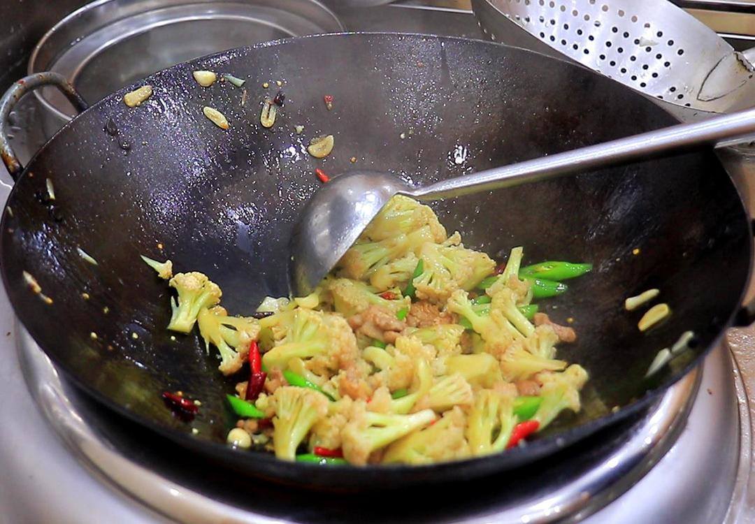 3.锅内烧油,充分滑锅以后倒出热油加入凉油,放入肉片煸炒出油脂,这样成菜会更香,肉片炒香、炒透明以后,放入蒜片、辣椒段和青红椒,开小火炒出香辣味,从锅边淋入一点料酒去腥,倒入花菜翻炒均匀,加入适量的生抽、食盐、鸡精,翻炒入味以后即可出锅。