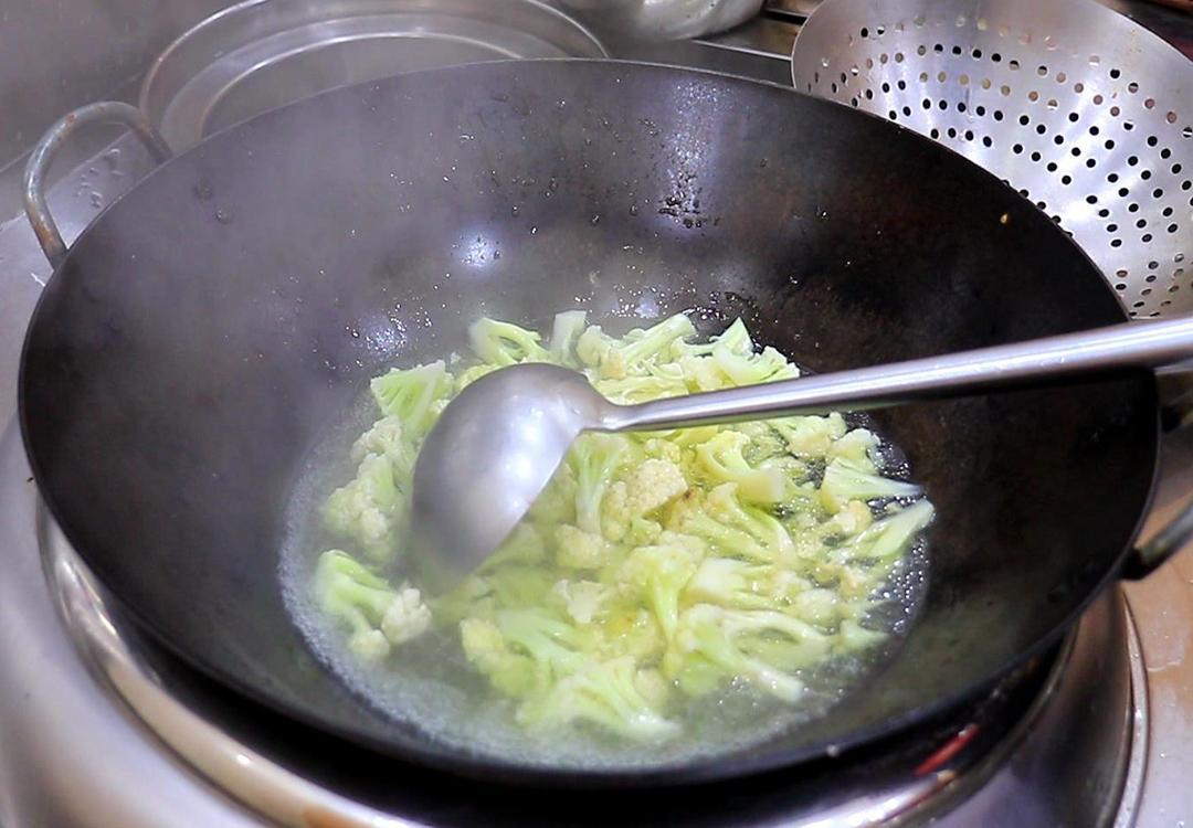2.锅中烧水,加入少许食盐入底味,水烧开以后倒入花菜,淋入少许植物油,锁住花菜中的营养,大约焯水1分钟,花菜断生以后倒出来,控水备用,这一步是为了让花菜生熟一致。