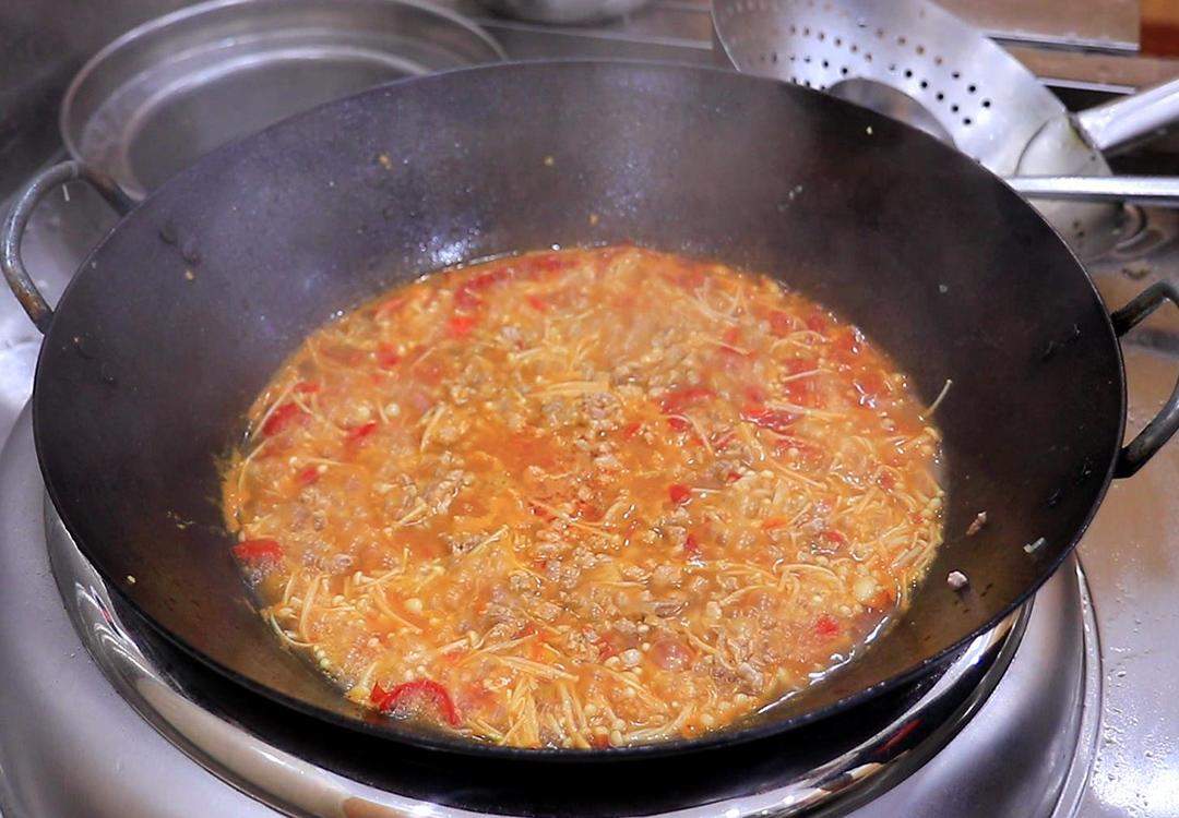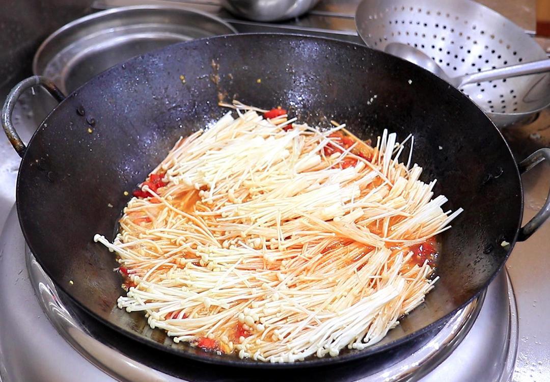 4.锅内烧油,油温五成热时倒入泡椒和野山椒,开小火翻炒几下,倒入姜蒜末一起翻炒出香味,把番茄丁倒入锅中炒软、炒出红汁,沿锅边淋入适量的清水,加入食盐2克,胡椒粉2克,少许老抽调底色,淋入一点野山椒水,大火烧开以后。放入金针菇用勺子摊开,盖上锅盖,转小火焖煮5分钟。